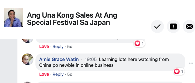 “Learning lots here watching from China po. newbie in online business"